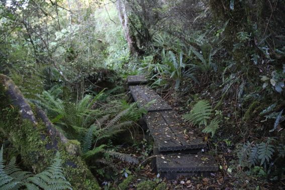 The track features a unique boardwalk - the lower section has small box boardwalks, and some open top rock boxes. 15 to 20 minutes from Sullivans Dam you will come to Calvert Dell. This creek crossing and small waterfall is named after the main benefactors to the track, the late Dick and Barbara Calvert.
