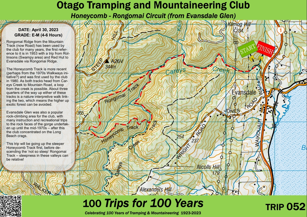 The Honeycomb Track is more recent (perhaps from the 1970s Walkways initiative?) and was first used by the club in 1980. As both tracks head from Careys Creek to Mountain Road, a loop from the creek is possible. About three quarters of the way up either of these tracks is a nature interpretive walk linking the two, which means the higher up exotic forest can be avoided.