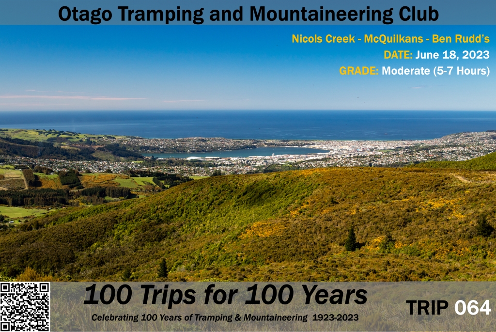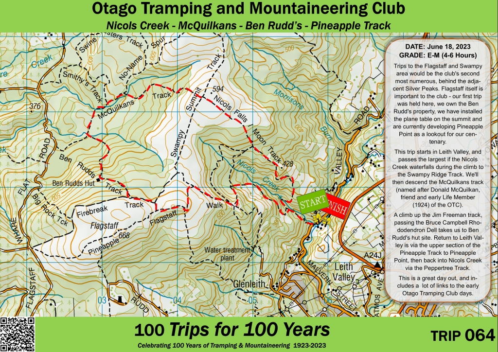 This trip starts in Leith Valley, and passes the largest if the Nicols Creek waterfalls during the climb to the Swampy Ridge Track. We'll then descend the McQuilkans track (named after Donald McQuilkan, friend and early Life Member (1924) of the OTC).