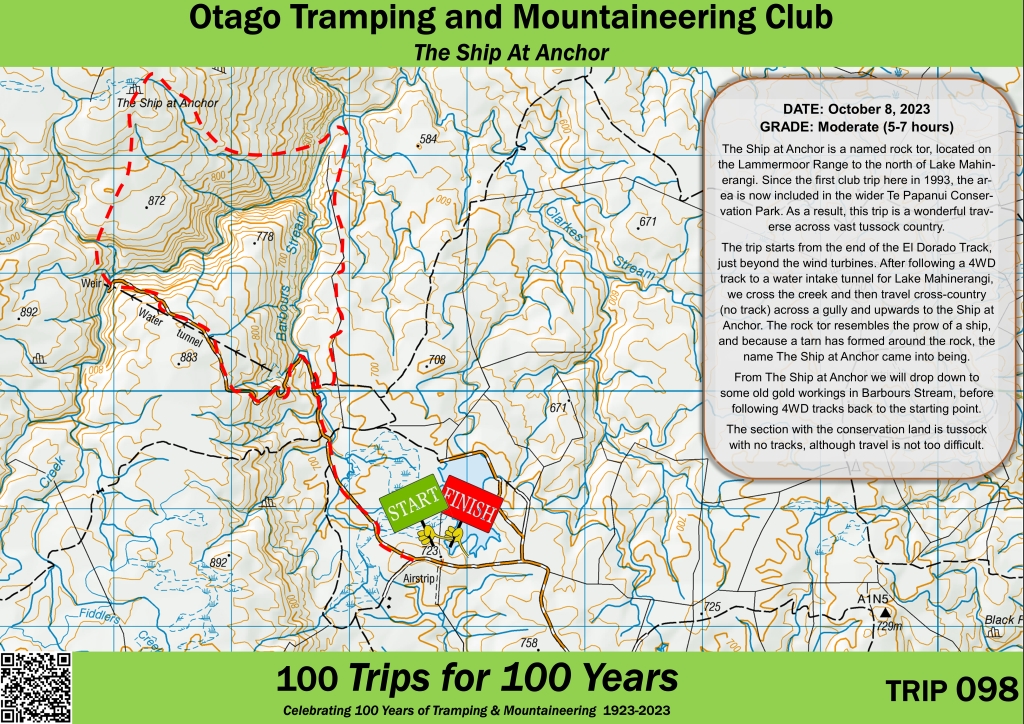 The trip starts from the end of the El Dorado Track, just beyond the wind turbines. After following a 4WD track to a water intake tunnel for Lake Mahinerangi, we cross the creek and then travel cross-country (no track) across a gully and upwards to the Ship at Anchor. The rock tor resembles the prow of a ship, and because a tarn has formed around the rock, the name The Ship at Anchor came into being.